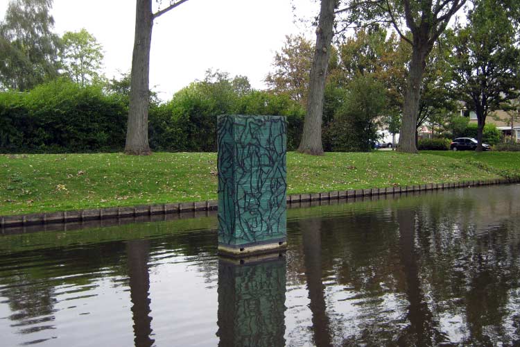 Het beeld bestaat uit glazen platen met staaldraadtekeningen. Het is een vierkant object in het water.